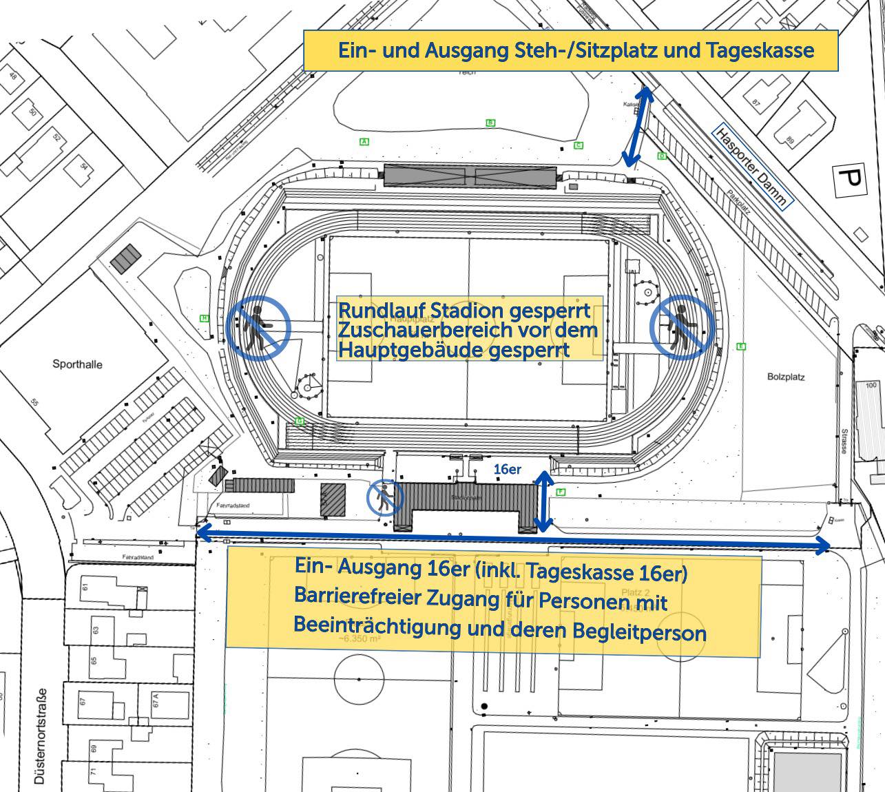 - Zuschauer gelangen ausschließlich über den Eingang Hasporter Damm neben der Haupttribüne ins Stadion, dort befinden sich auch die Tageskassen
